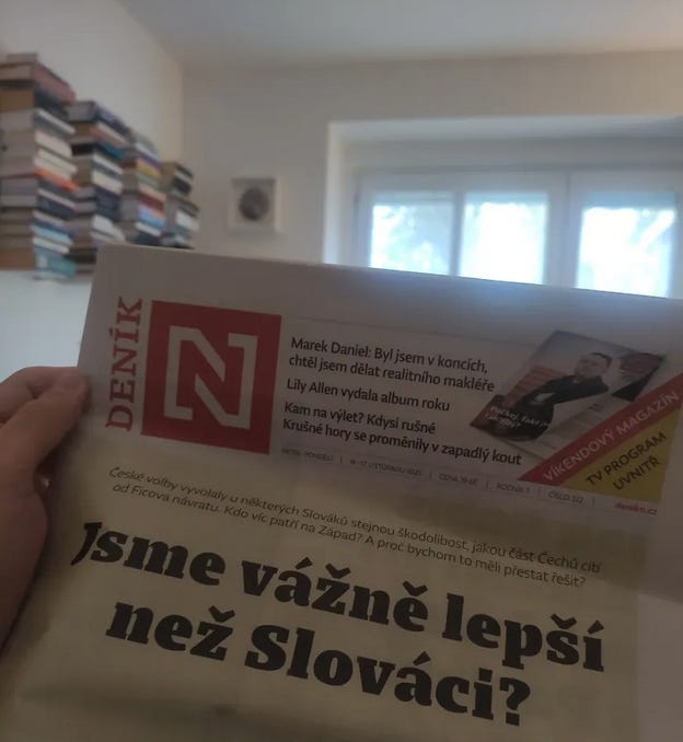 Výsledkom bolo viacero esejí a komentárov, v ktorých som tento rozdiel reflektoval, napríklad Kolónia Felvidék pre Kapitál. Bola aj zaujímavá diskusia v Pražskej kaviarni. Teraz som mal vďaka Filipovi Zajíčkovi z českého Deníku N príležitosť pretaviť túto diskusiu opäť do podoby rozsiahlejšieho textu k českým voľbám. V ňom sumarizujem český kultúrny mýtus o Slovensku a aj to, ako tento mýtus sedí do kontextu väčšieho mýtu o Západe a Východe, ktorý aj dnes stále slúži laickej, mienkotvornej a čiastočne i odbornej komunite v procese utvárania významu z chaotického politického procesu v našich štátoch.